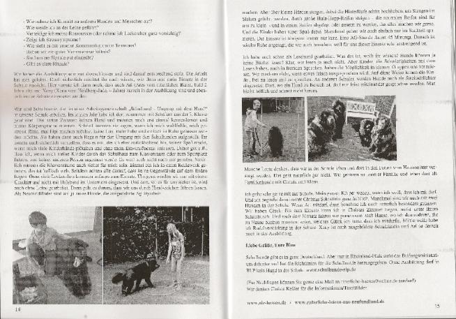 Unsere Hündinnen Blue (verstorben März 2018) und Xeny werden als ausgebildete Schulhunde am Marion-Dönhoff-Gymnasium in Lahnstein eingesetzt. Dort sind sie im Arbeitsgemeinschaftsbereich "Umgang mit dem Hund", "Körpersprache des Hundes", "Keine Angst vor dem großen Hund" eingesetzt. Sie besuchen aber auch Klassen, stehen in der Biologie zur Verfügung. Die ruhige und gelassene Blue arbeitet als "Lesehund" pädagogisch unterstützend in der Leseförderung. Xeny, die sehr Körperkontakt und Aktionen liebt, ist in den anderen Einsatzgebieten lieber aktiv. Unser Rüde Ares ist noch in der Ausbildung. Im Rahmen der Ausbildung arbeitet er ebenfalls als Schulhund und hat viel Freude an dieser Aufgaben.