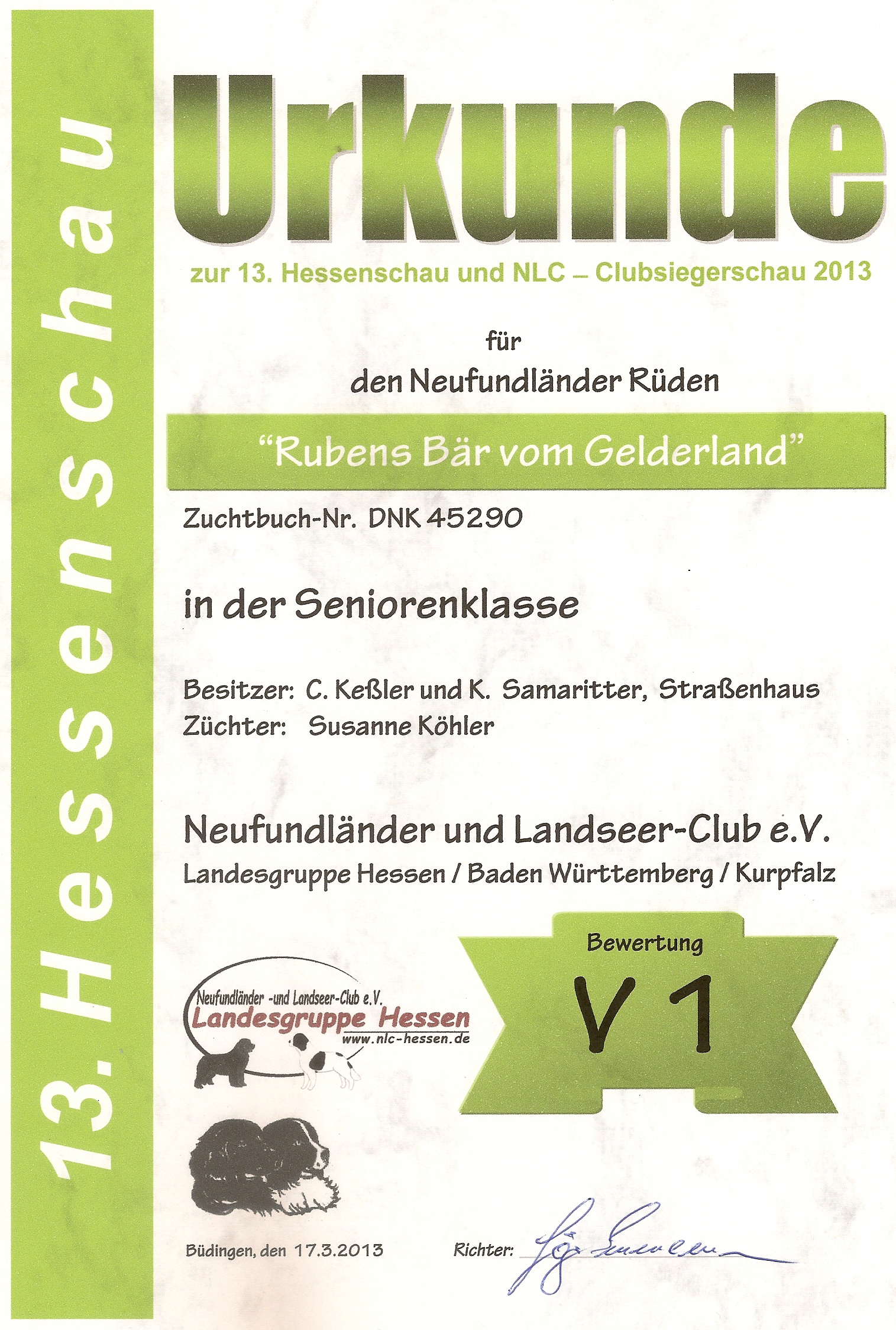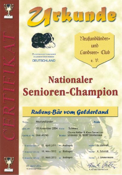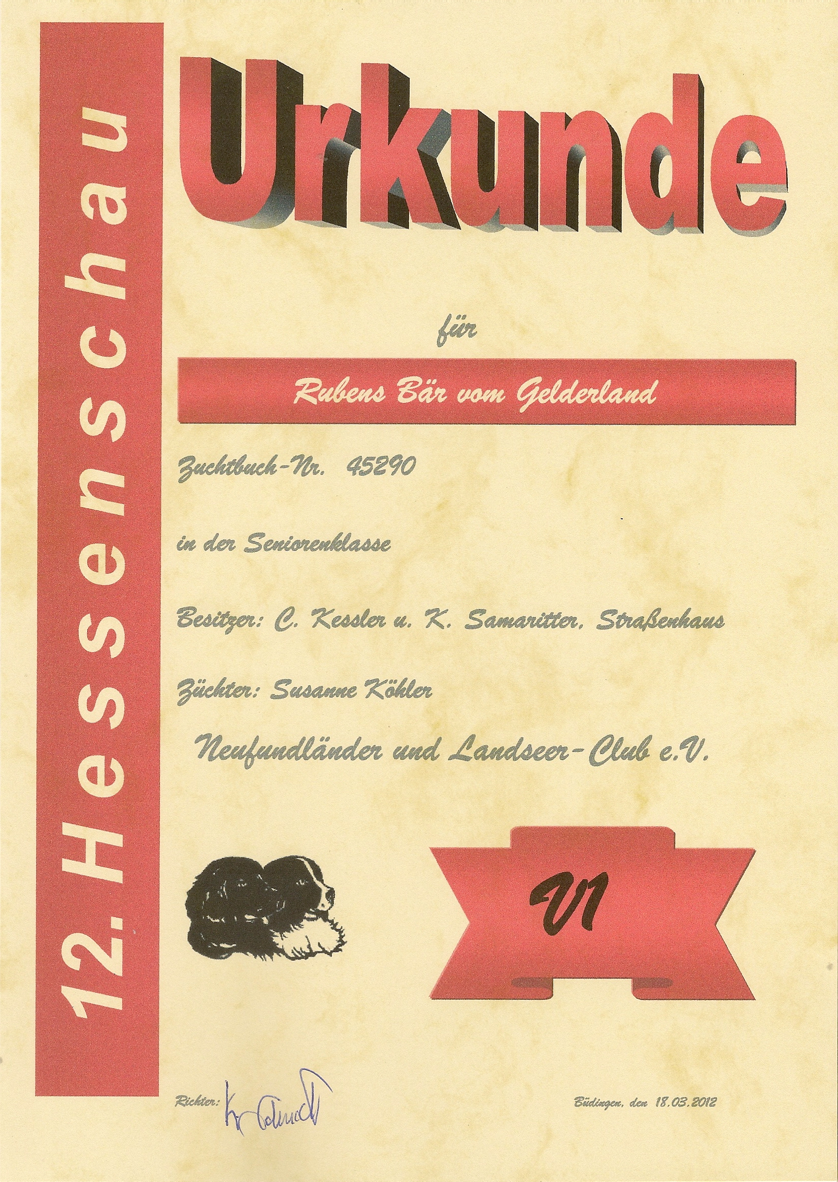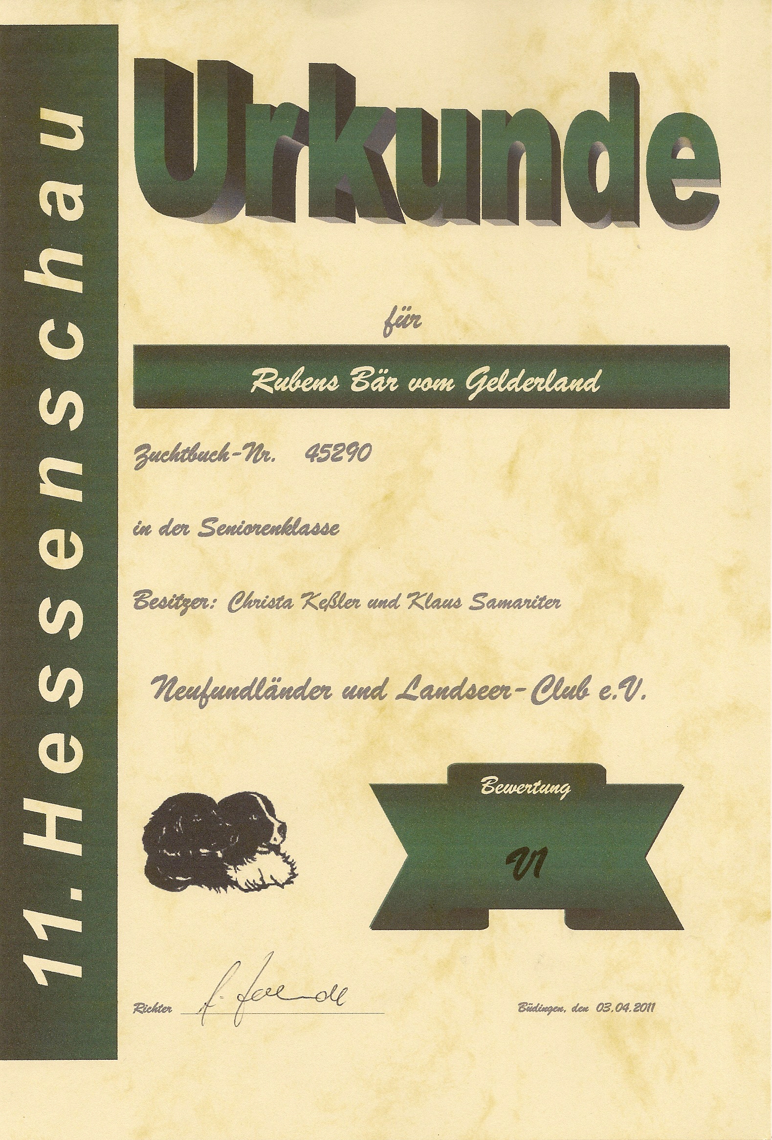 Im Jahr 2011 wurde er in der 11. Hessenschau des NLC-Hessen in der Seniorenklasse mit einem V 1 ausgezeichnet, wurde bester Neufundländer der Schau und bekam den Titel des besten Hundes der Schau.