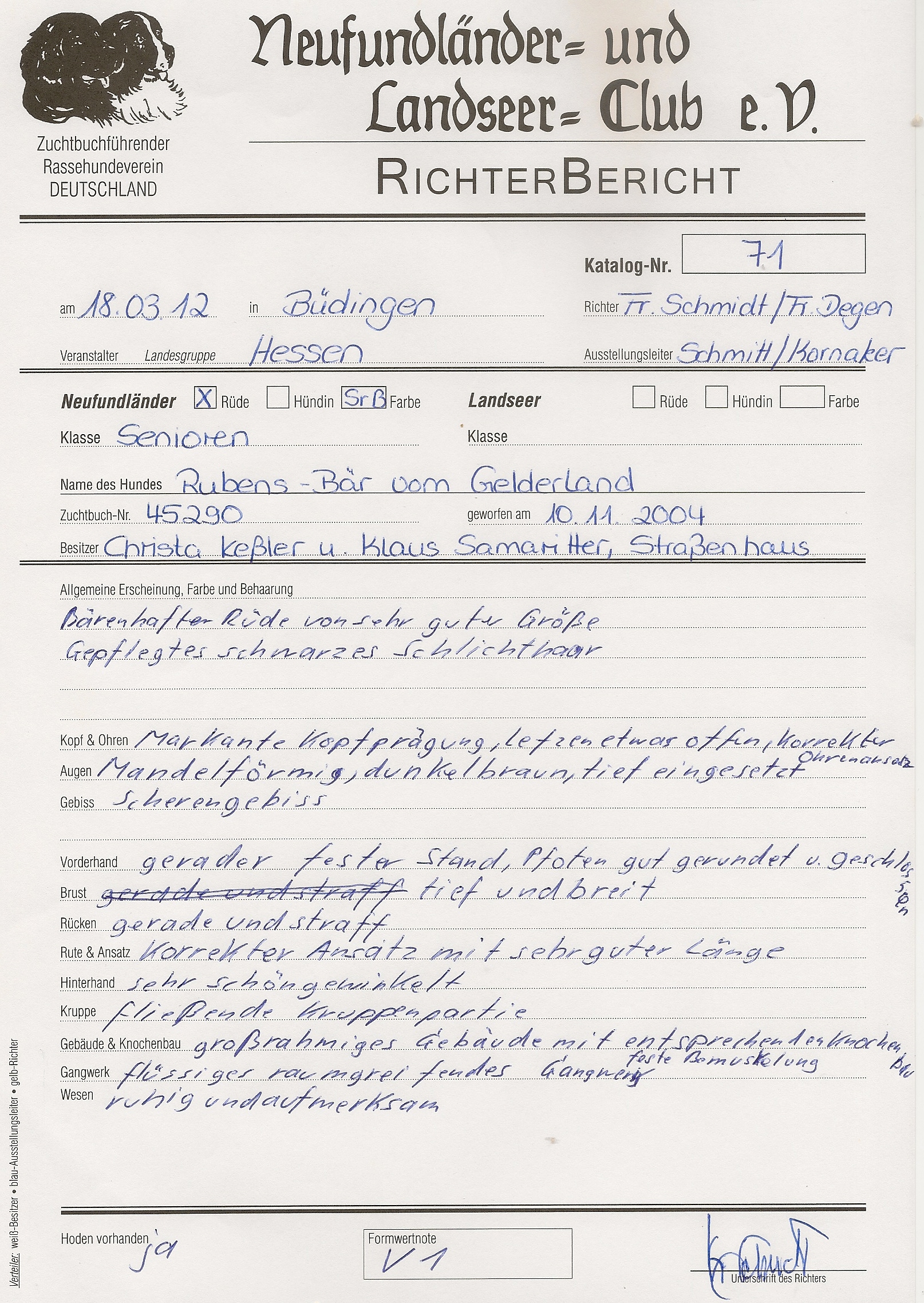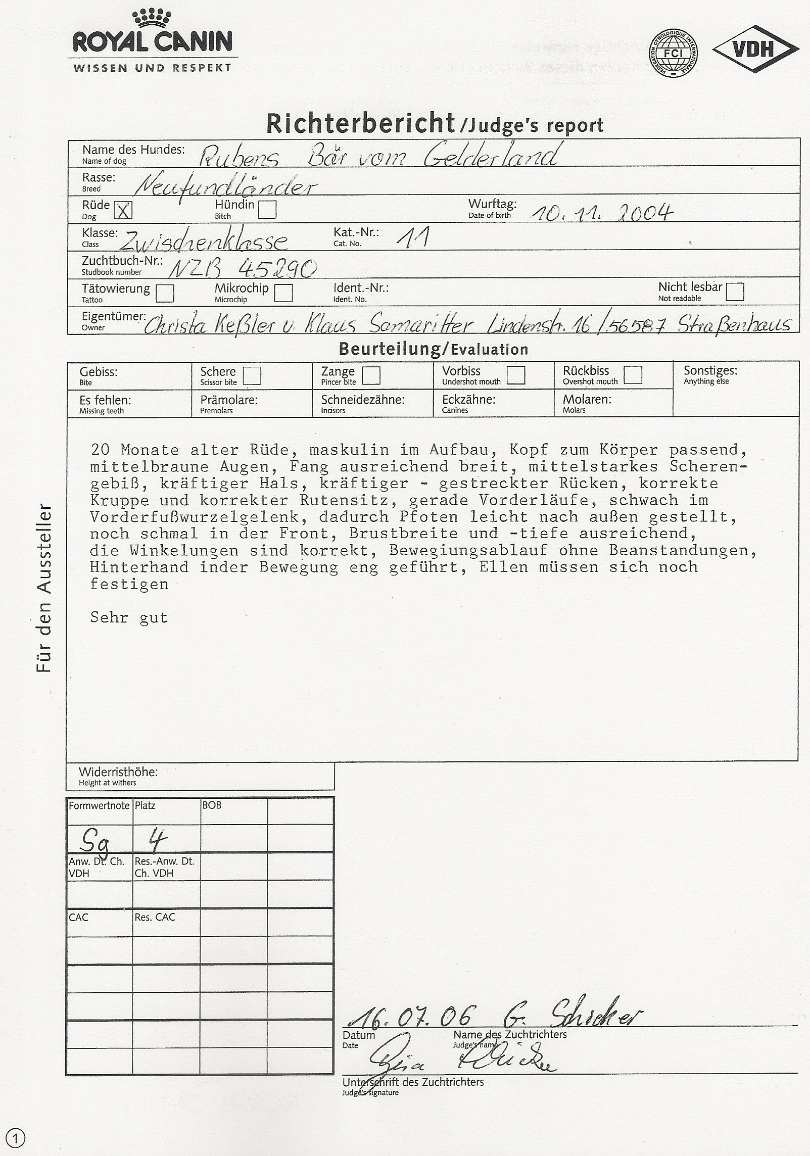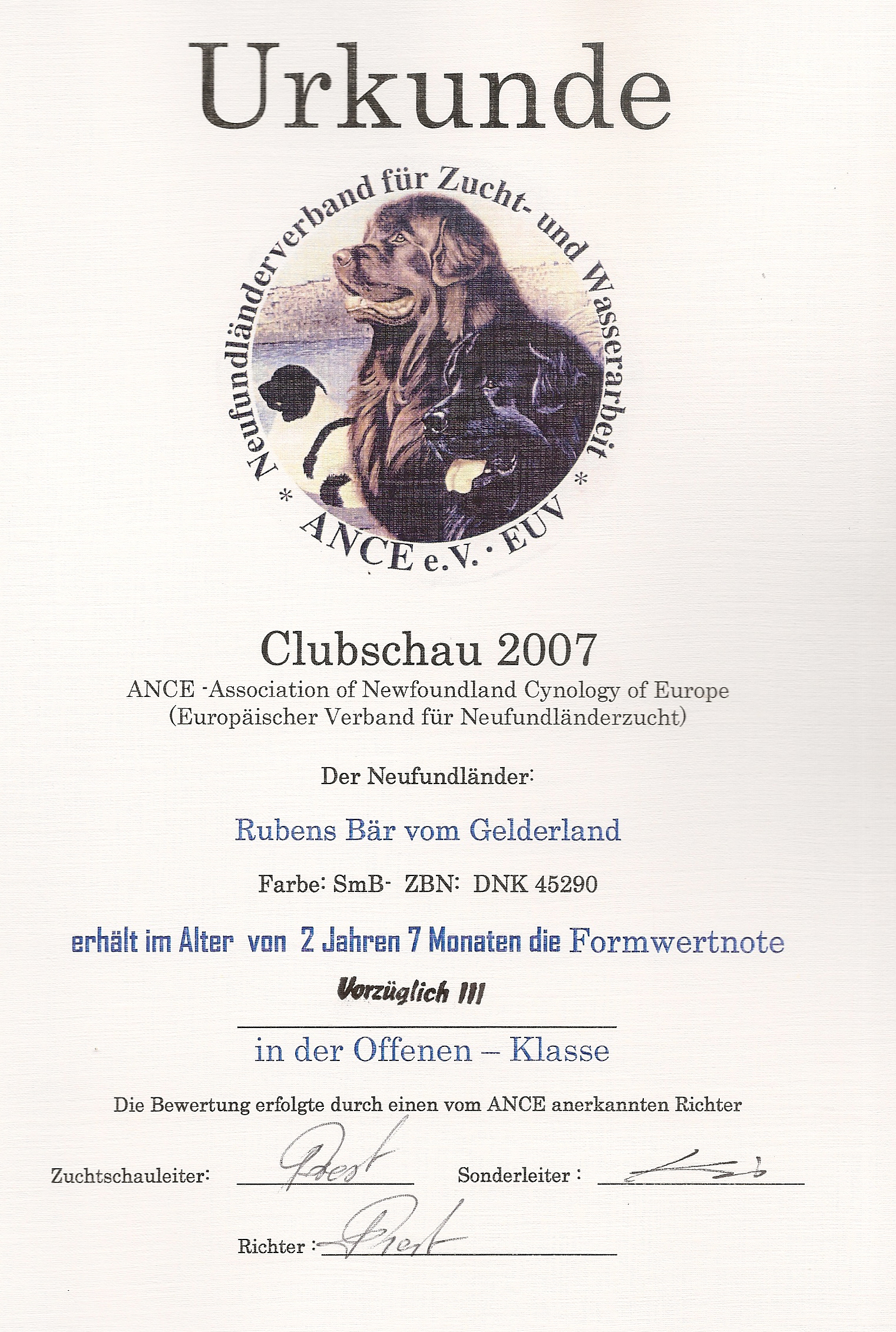 Im Neufundländerclub für Europa, in dem wir bis zum Jahr 2009 Mitglied waren, erhielt Ruby 2007 in der offenen Klasse die Wertung V 3.