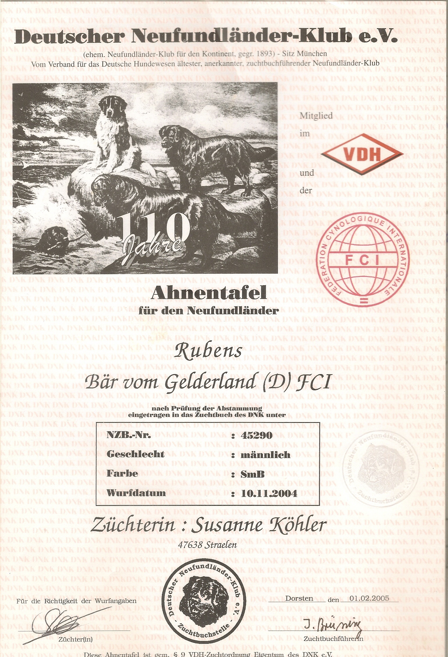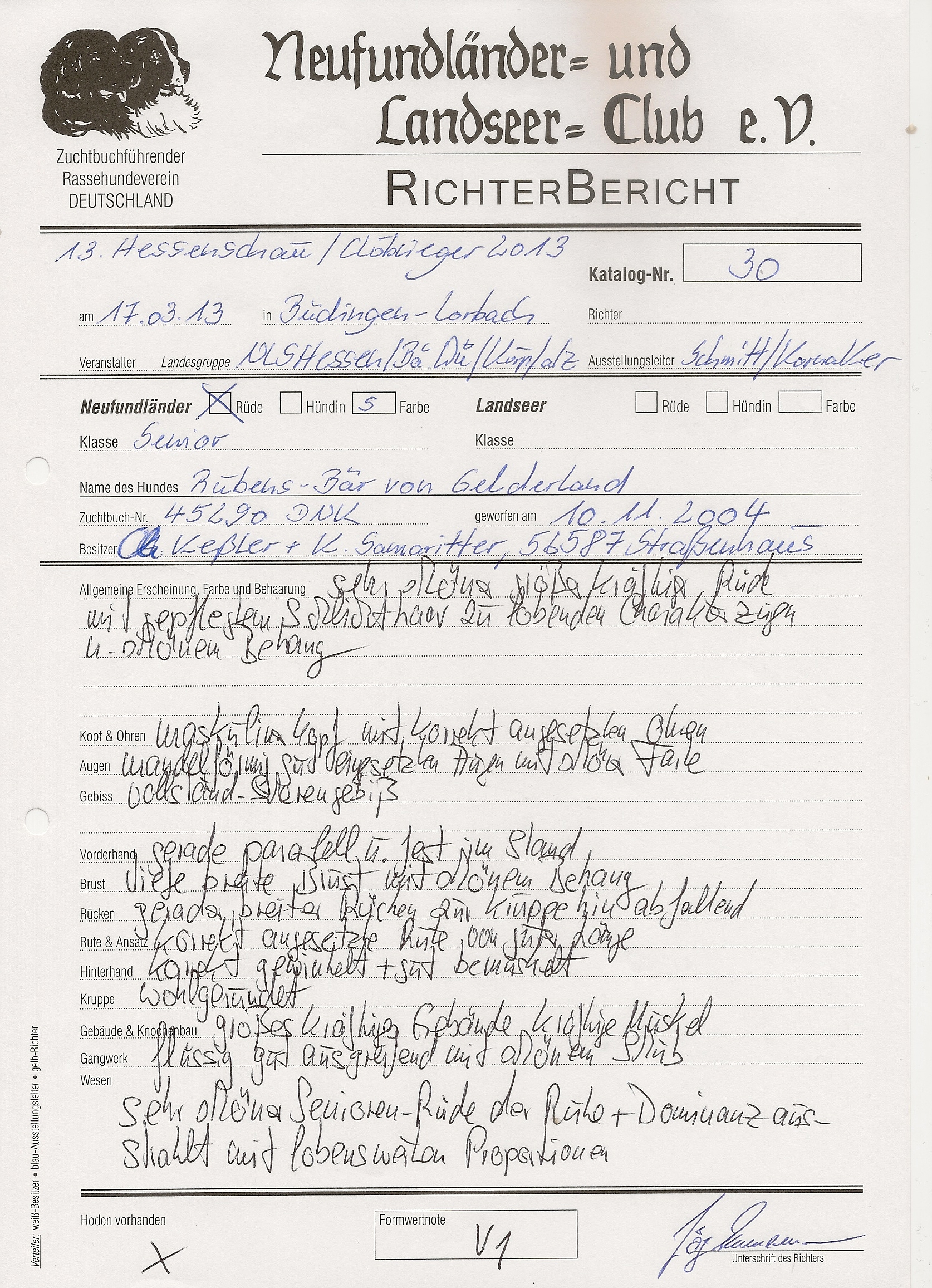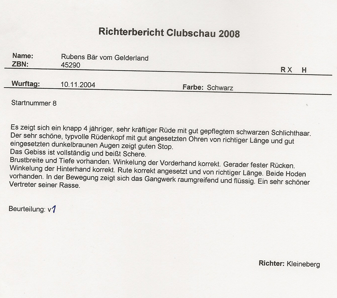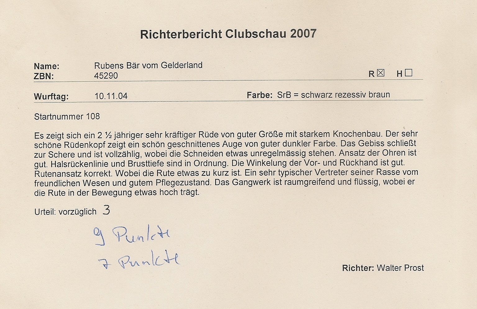 Zur Zucht wurde Rubens am 30. April 2006 mit einem "vorzüglich" zugelassen.