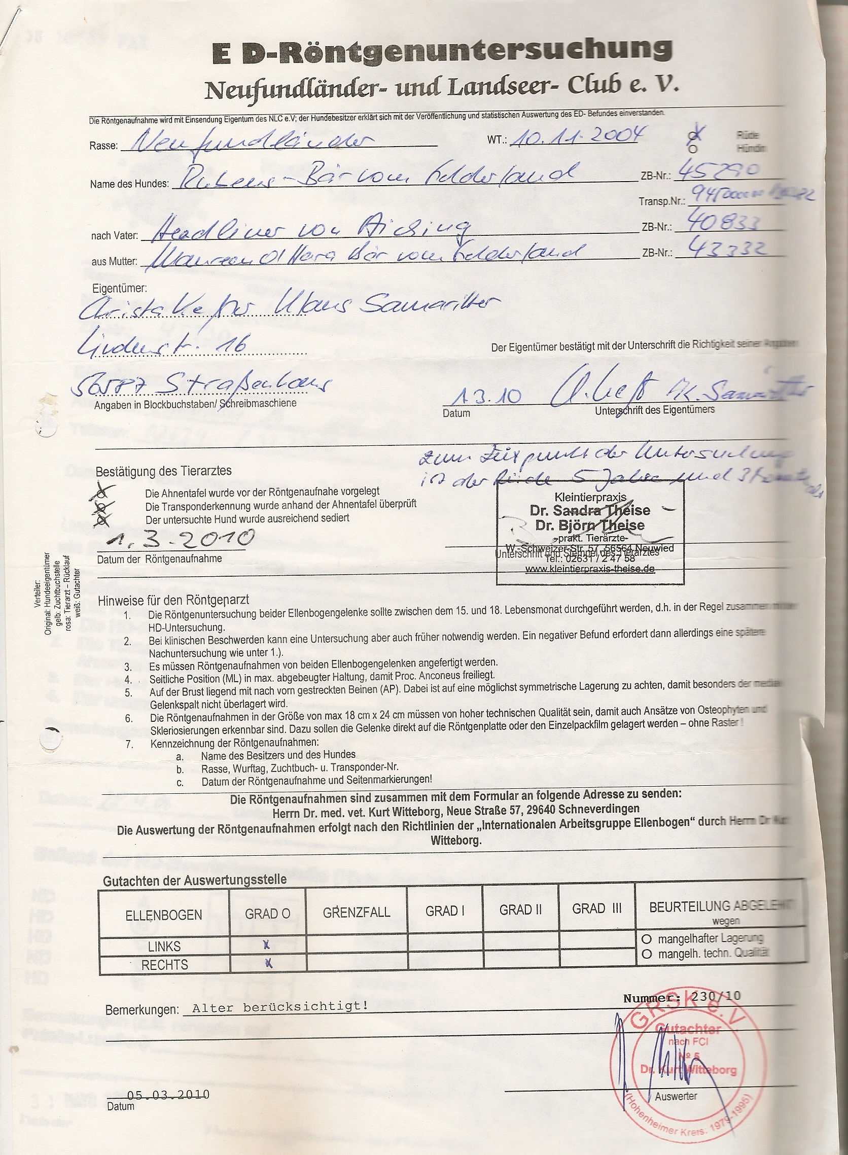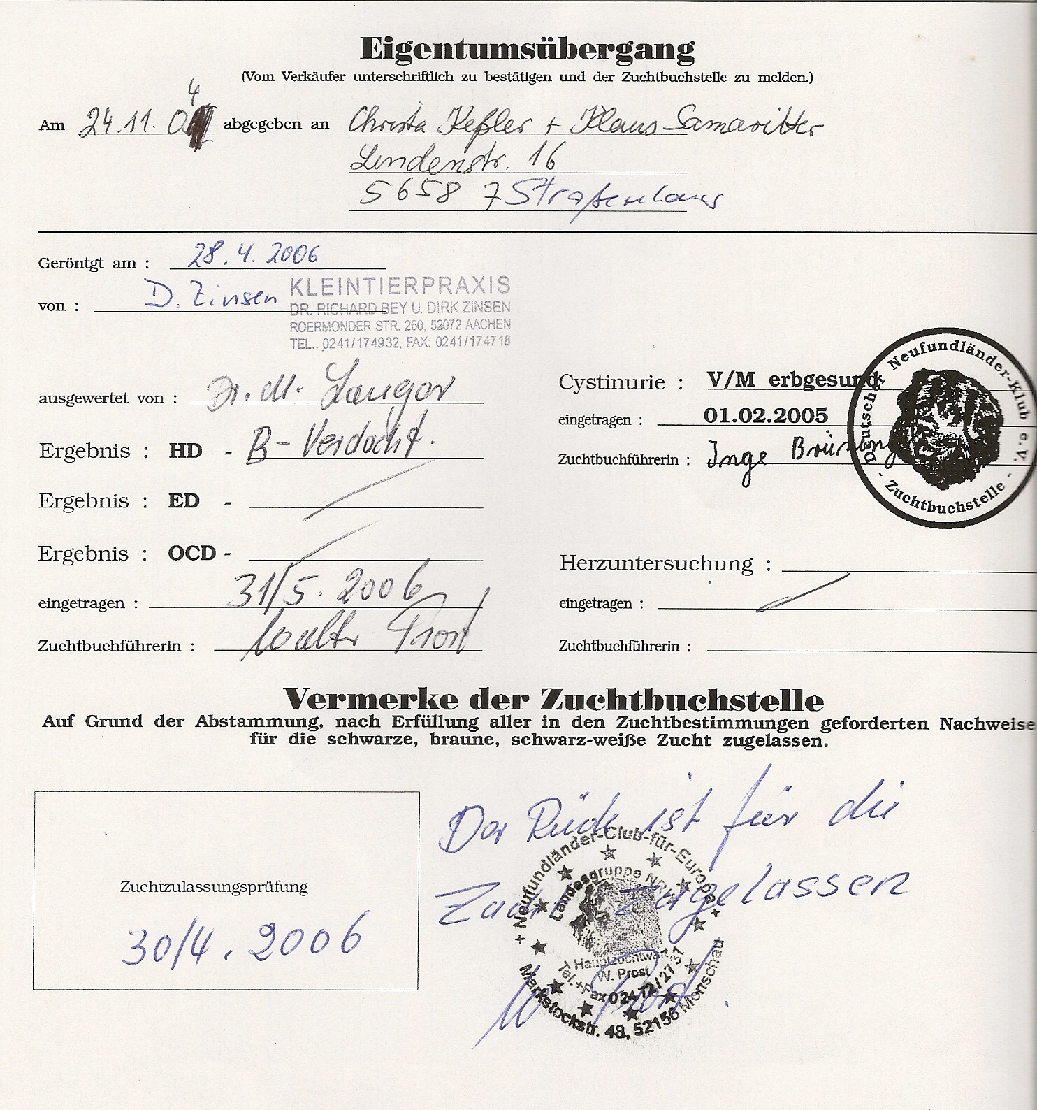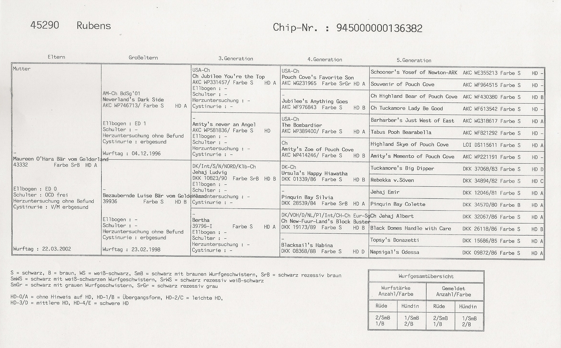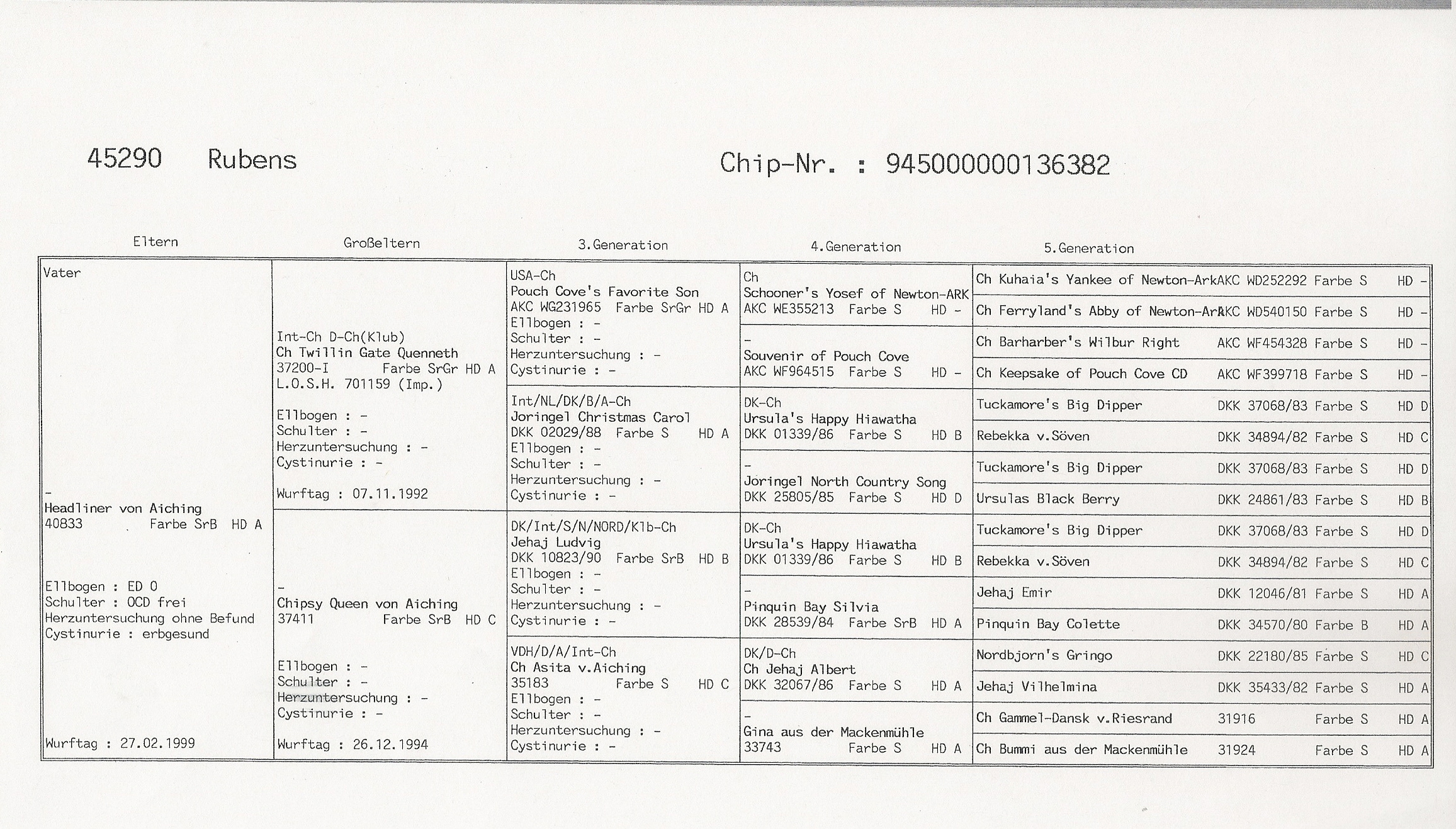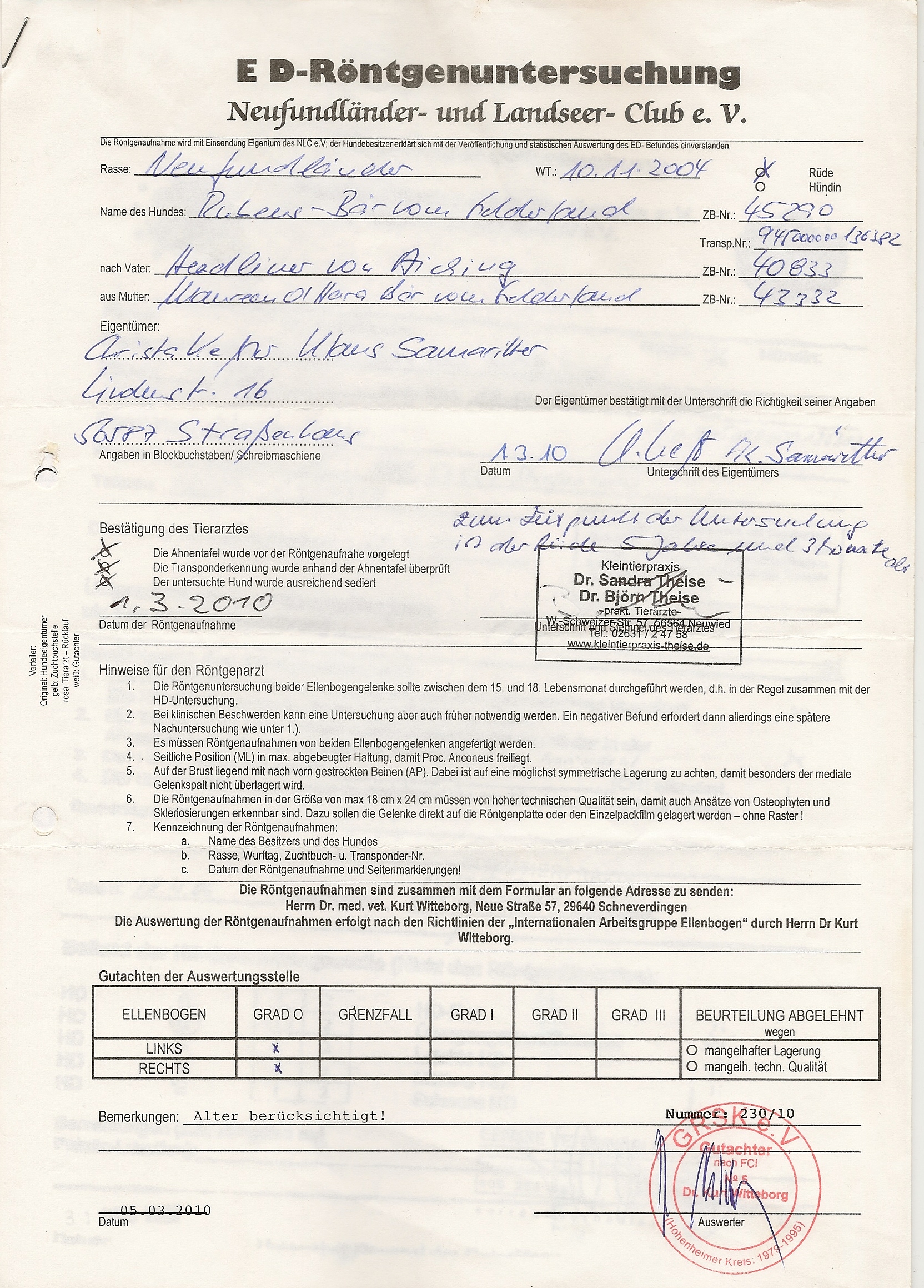 Zur Zucht wurde Rubens am 30. April 2006 mit einem "vorzüglich" zugelassen.