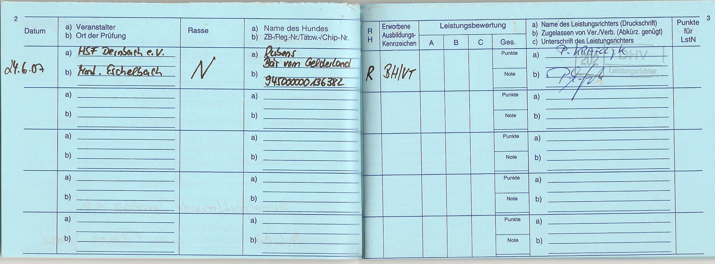 Seine Begleithundeprüfung hat er im Jahr 2007 im Hundesportfreunde-Verein Dernbach mit einem Pokal für den zweiten Platz absolviert.